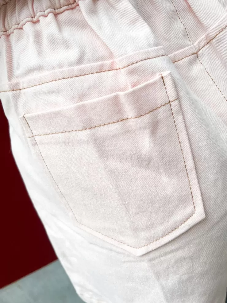 後方除了做雙口袋設計外,後腰部分也有做收縮彈性 ,並且在版型線都有上特別在做包邊細節滿滿