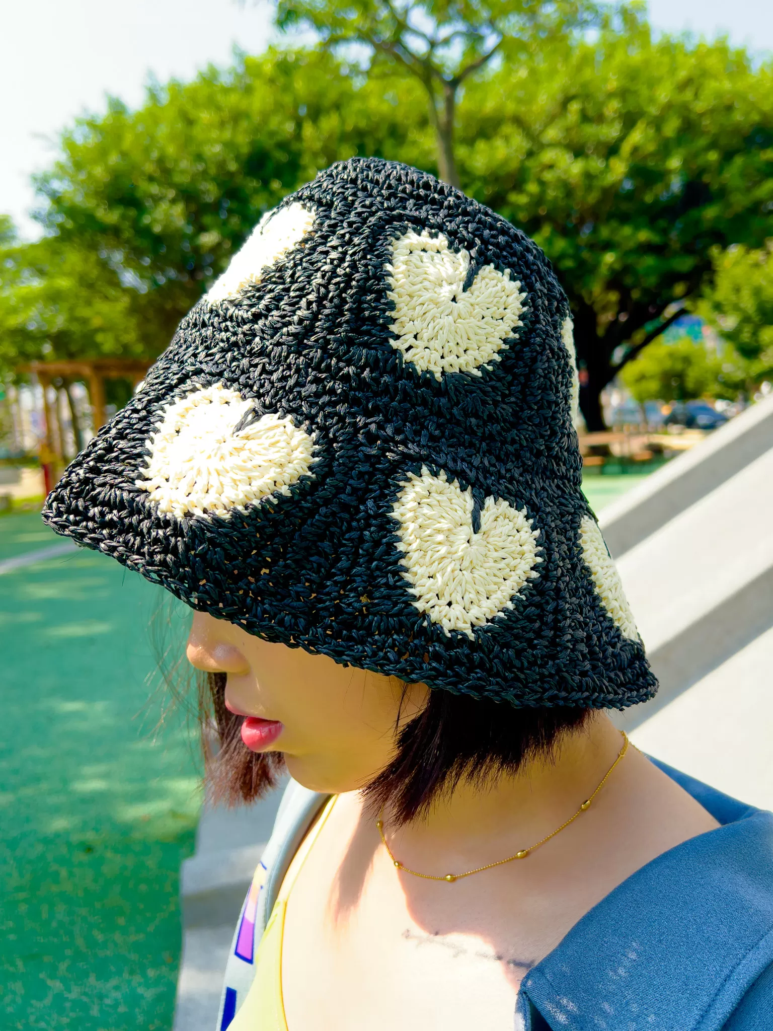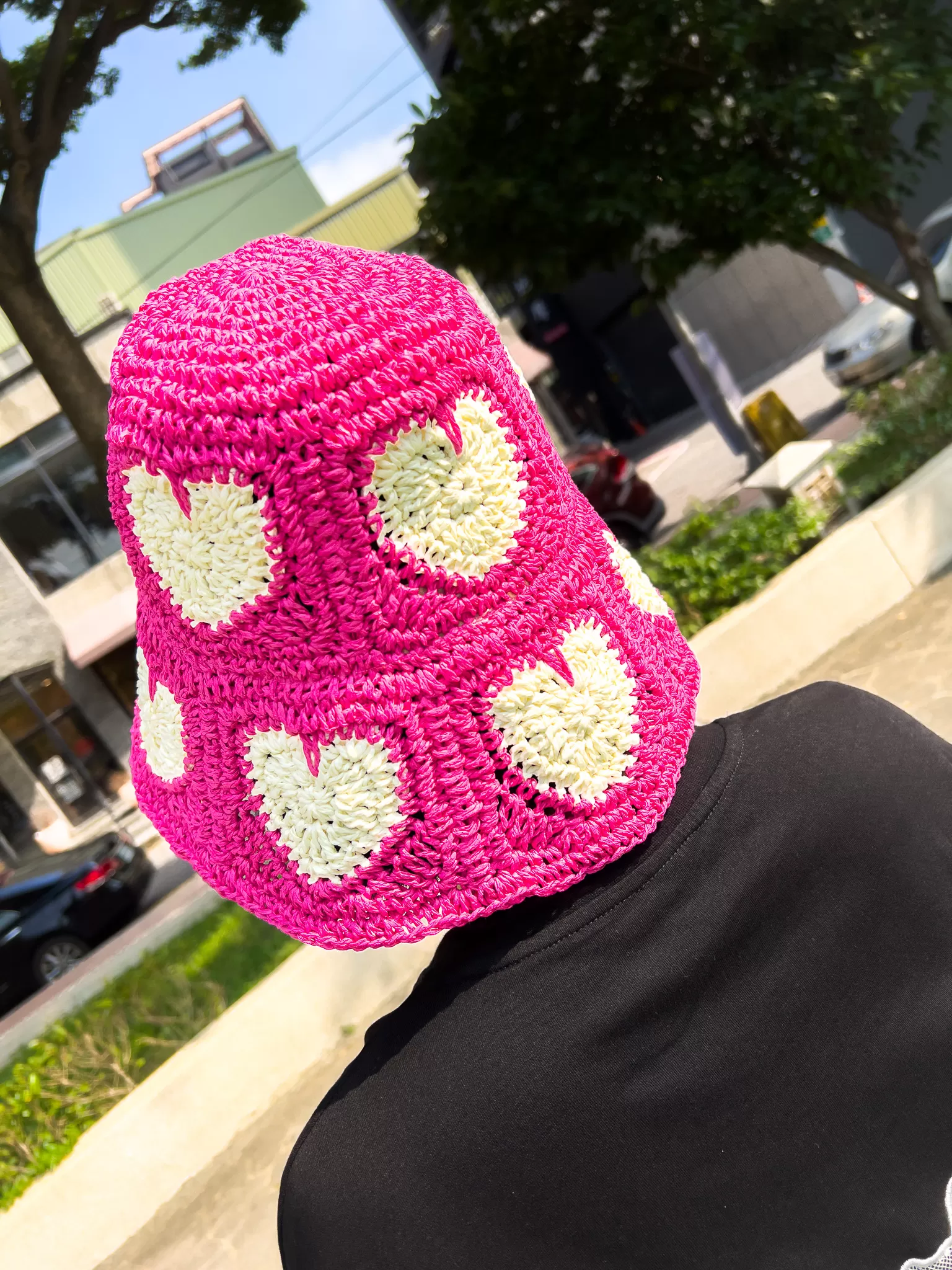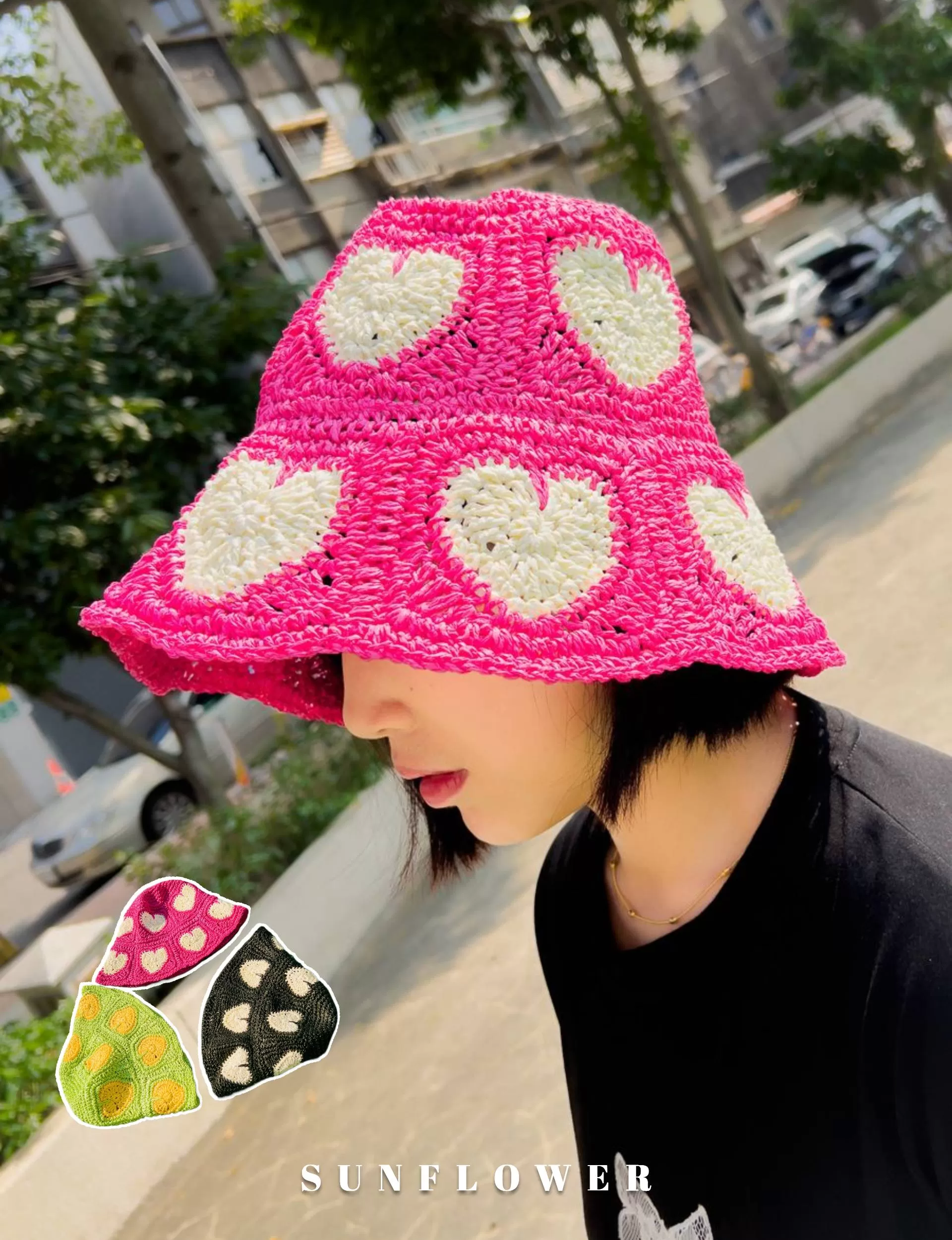 日系撞色愛心 |復古粗編織 |大帽簷草帽(3色)