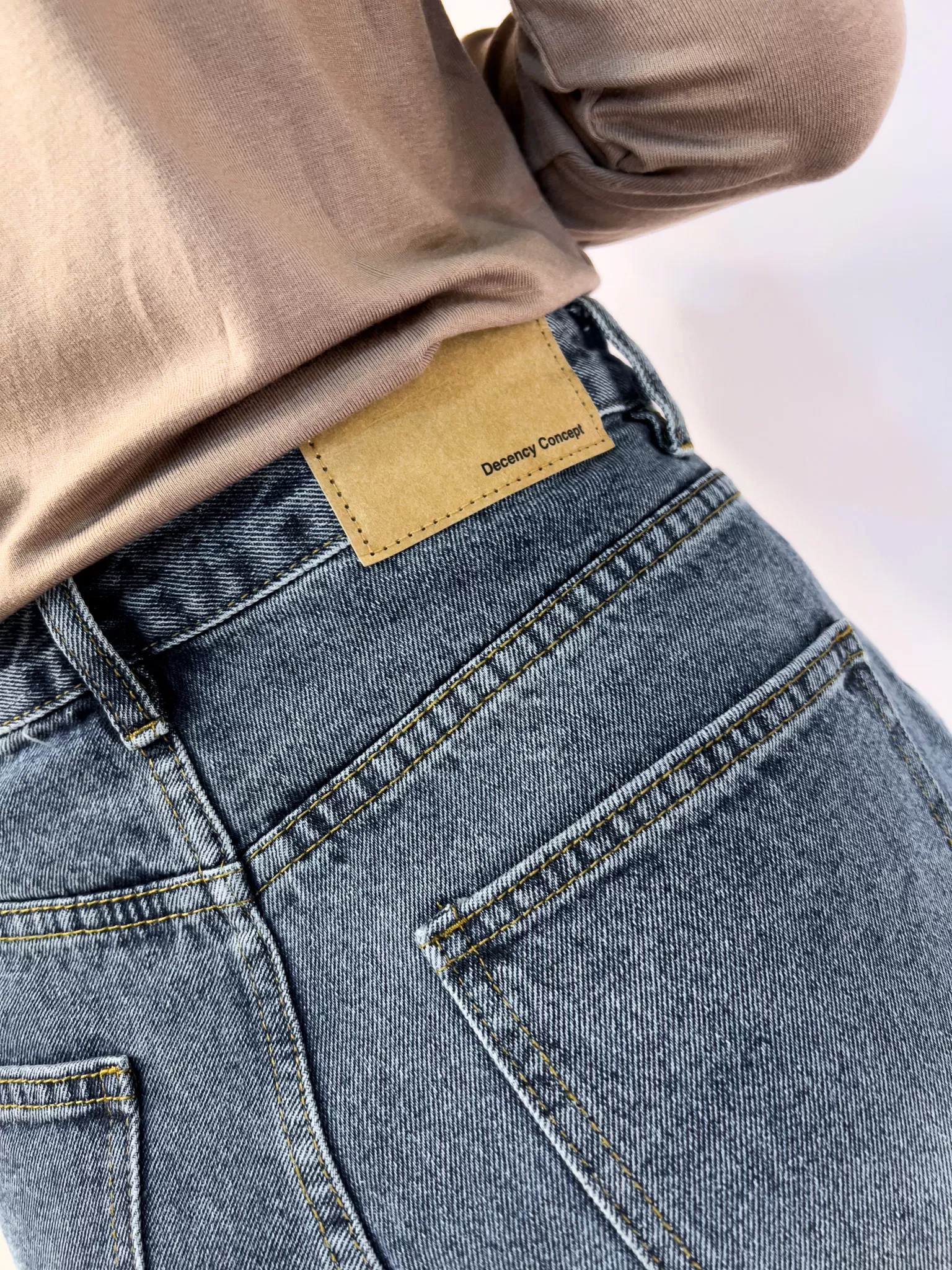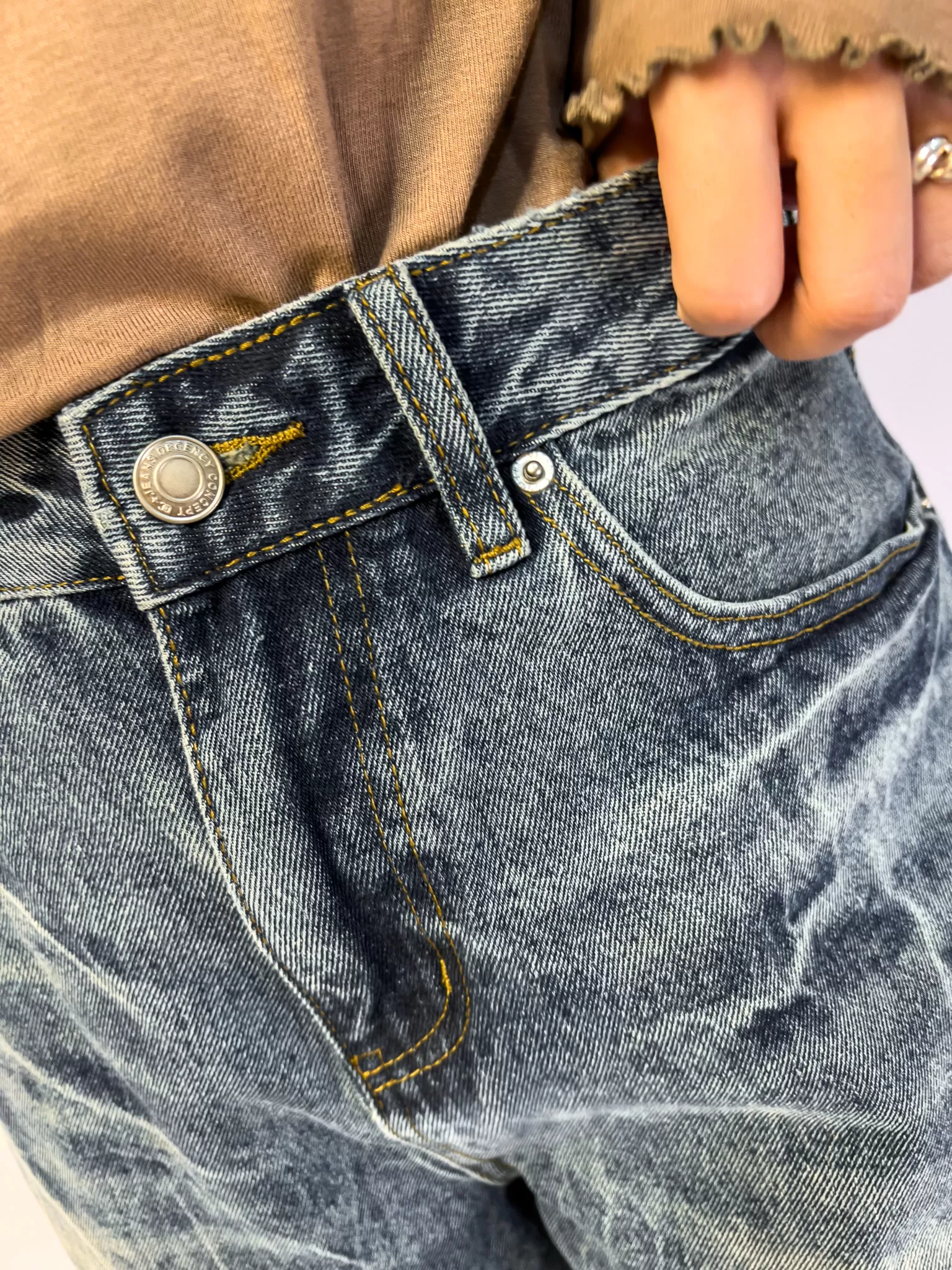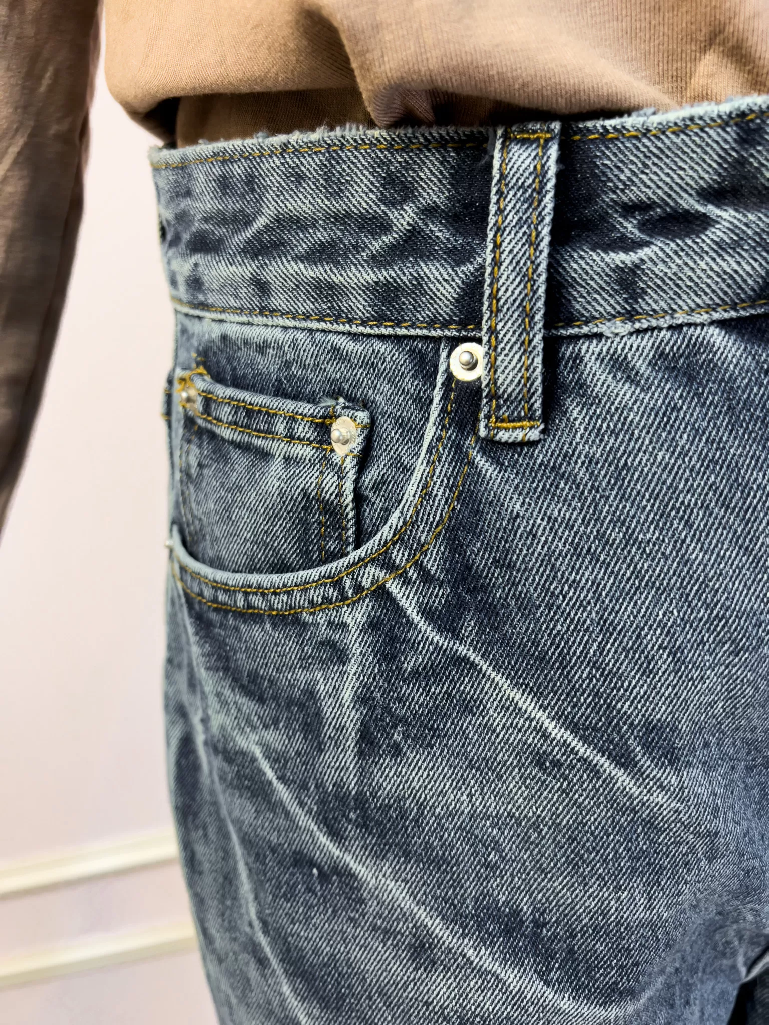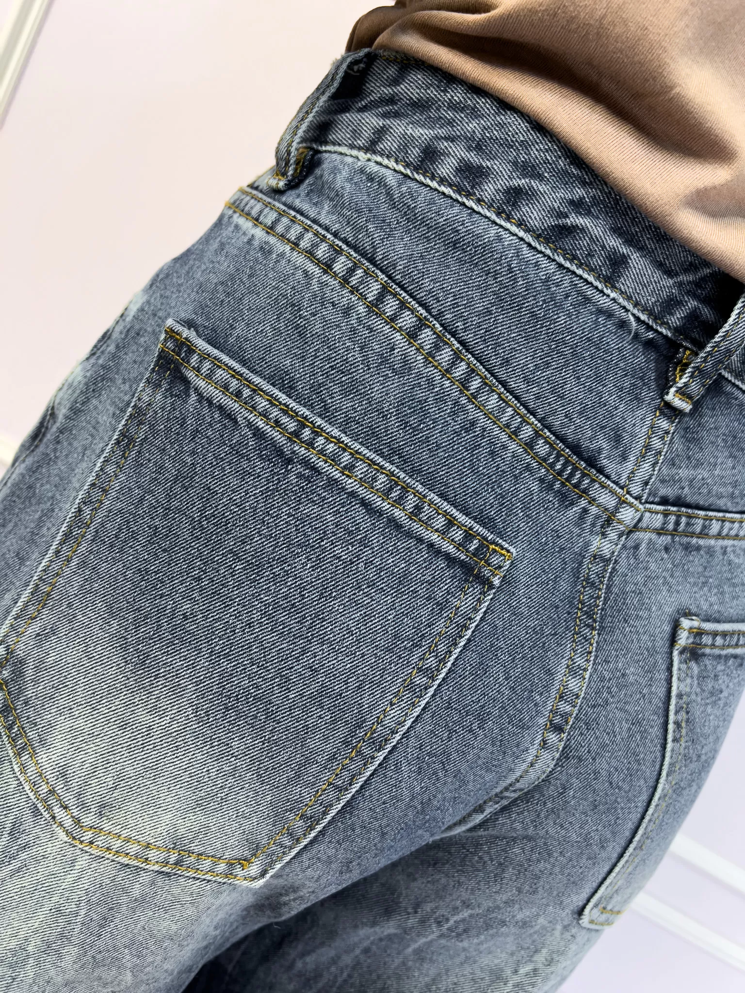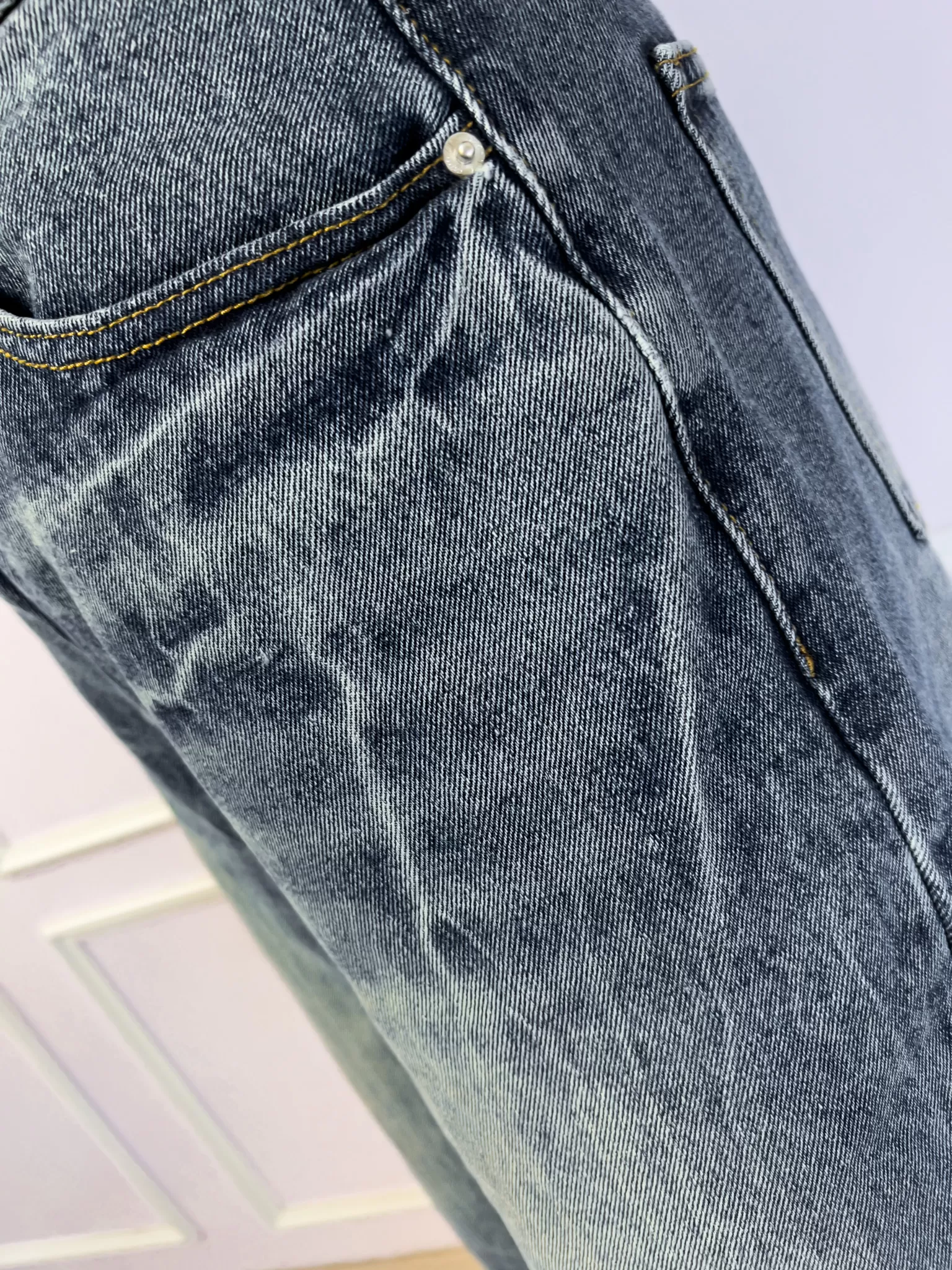*高磅數的丹寧布料 搭配 寬版直桶版型, 挺度在線,修飾不貼腳