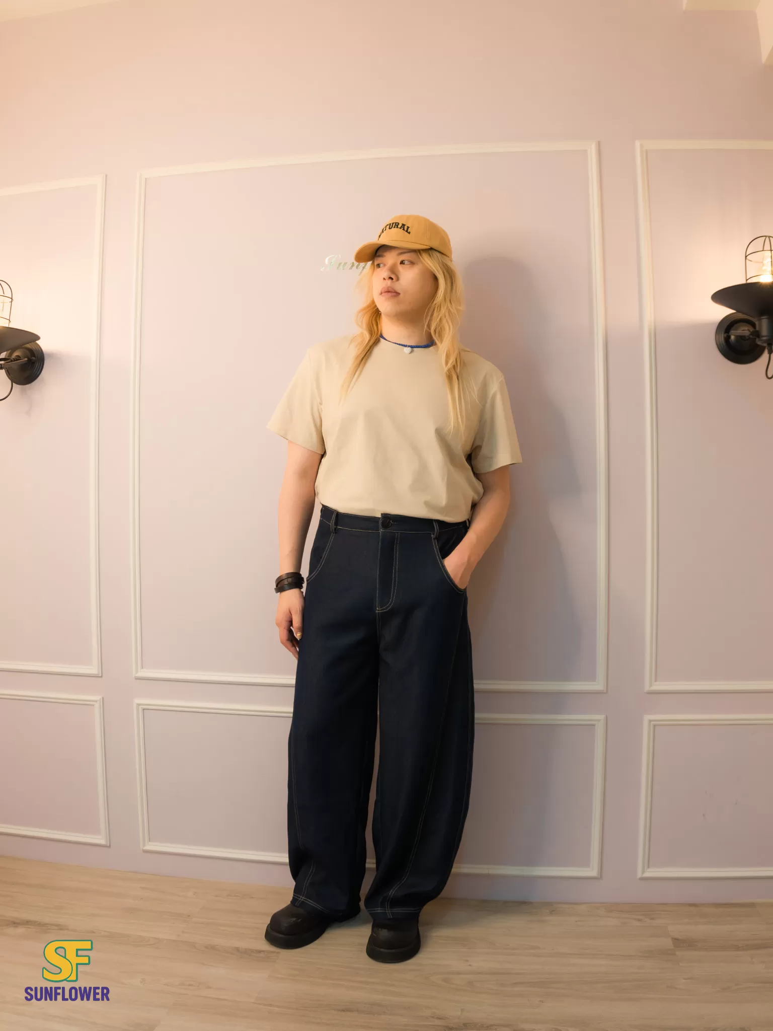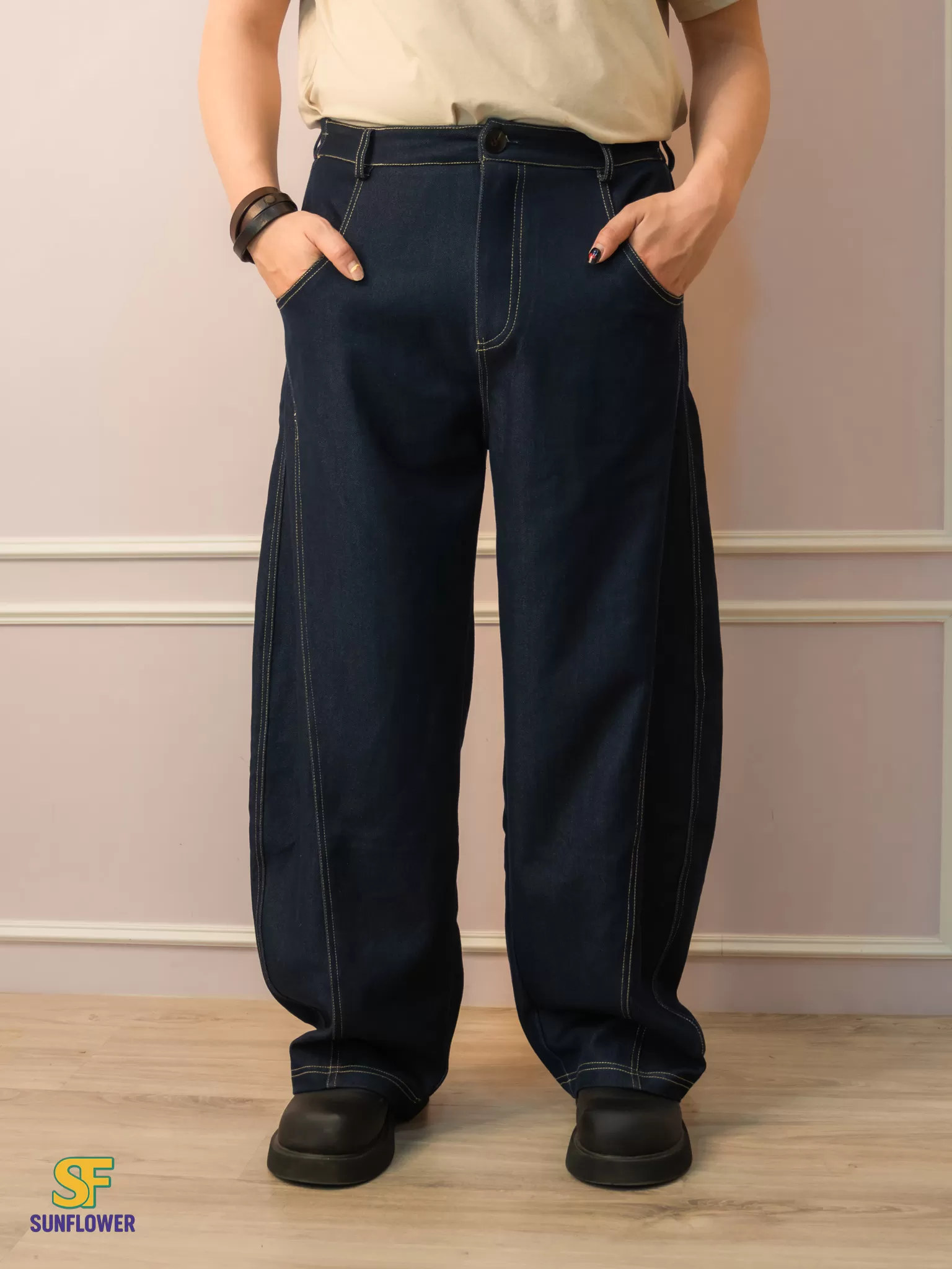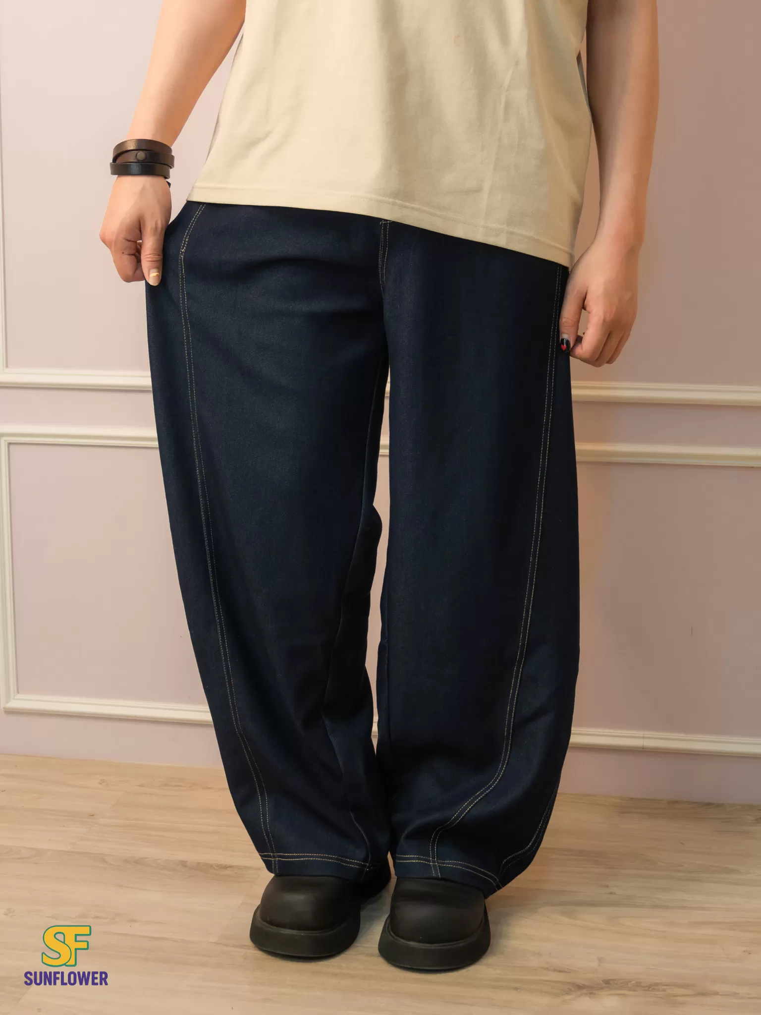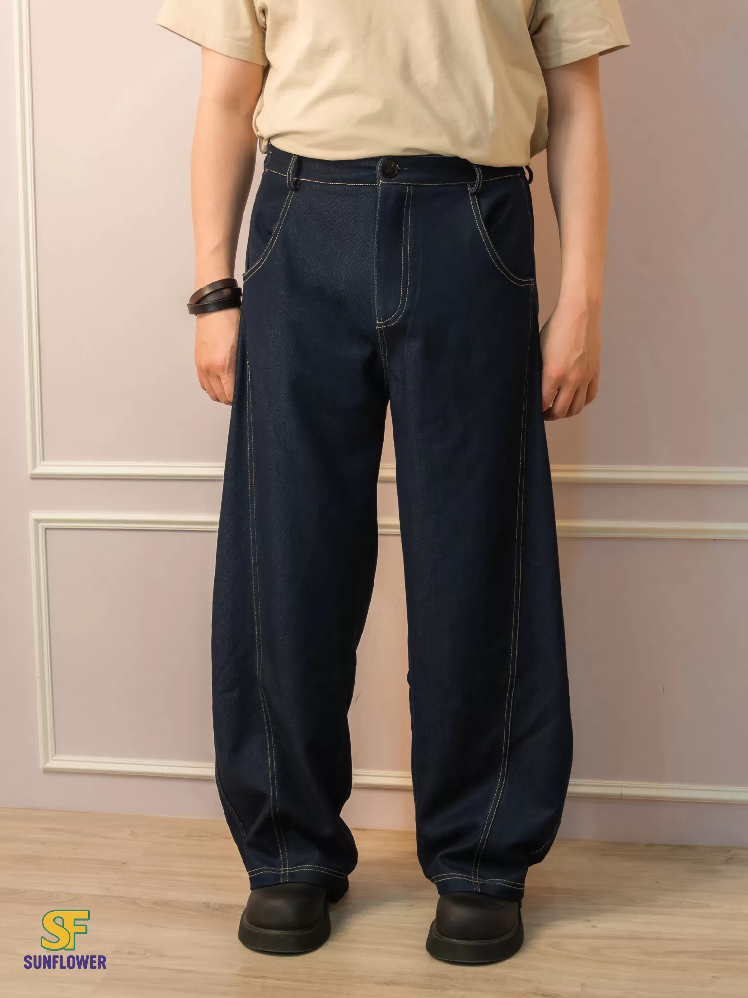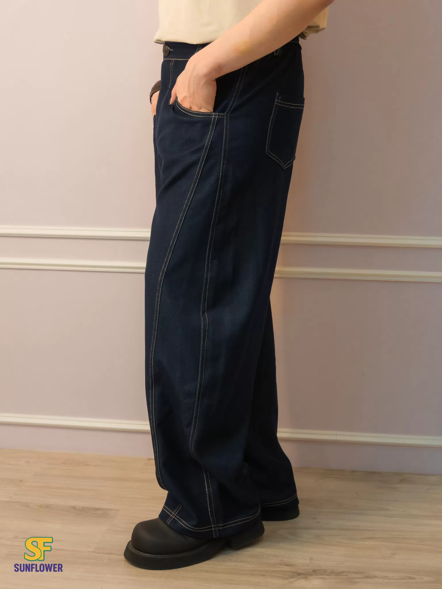 *A字形寬褲搭配菱形版型線,讓褲子保持自然的空間垂墜落地感