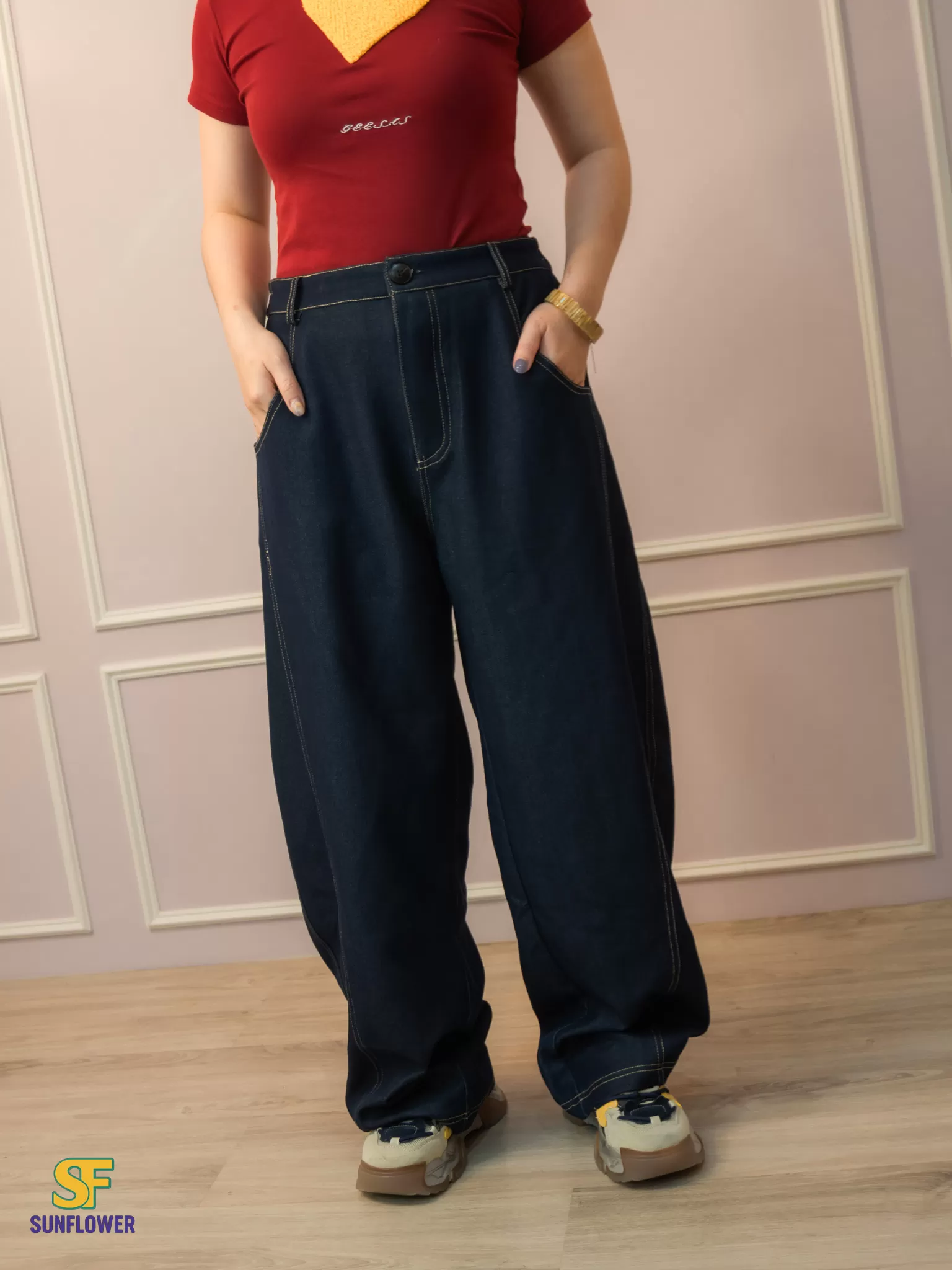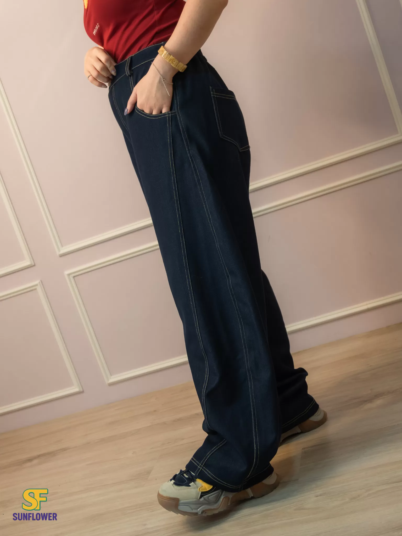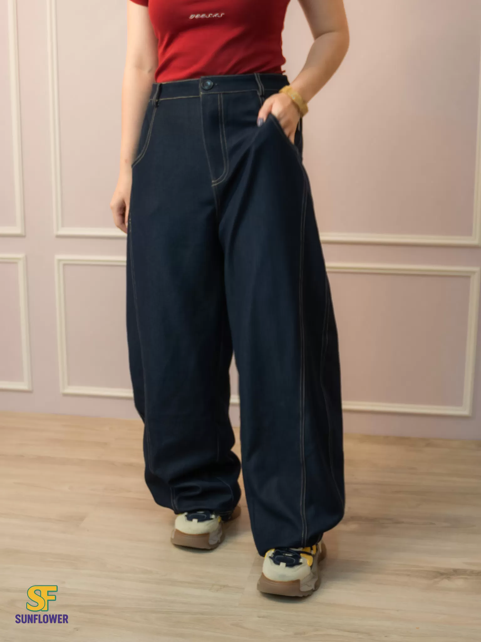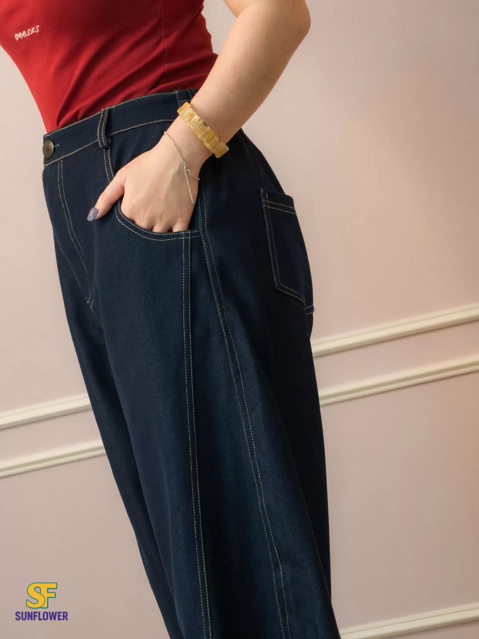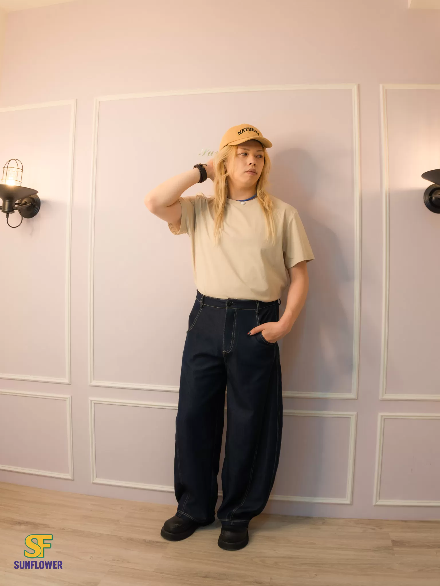 *A字形寬褲搭配菱形版型線,讓褲子保持自然的空間垂墜落地感