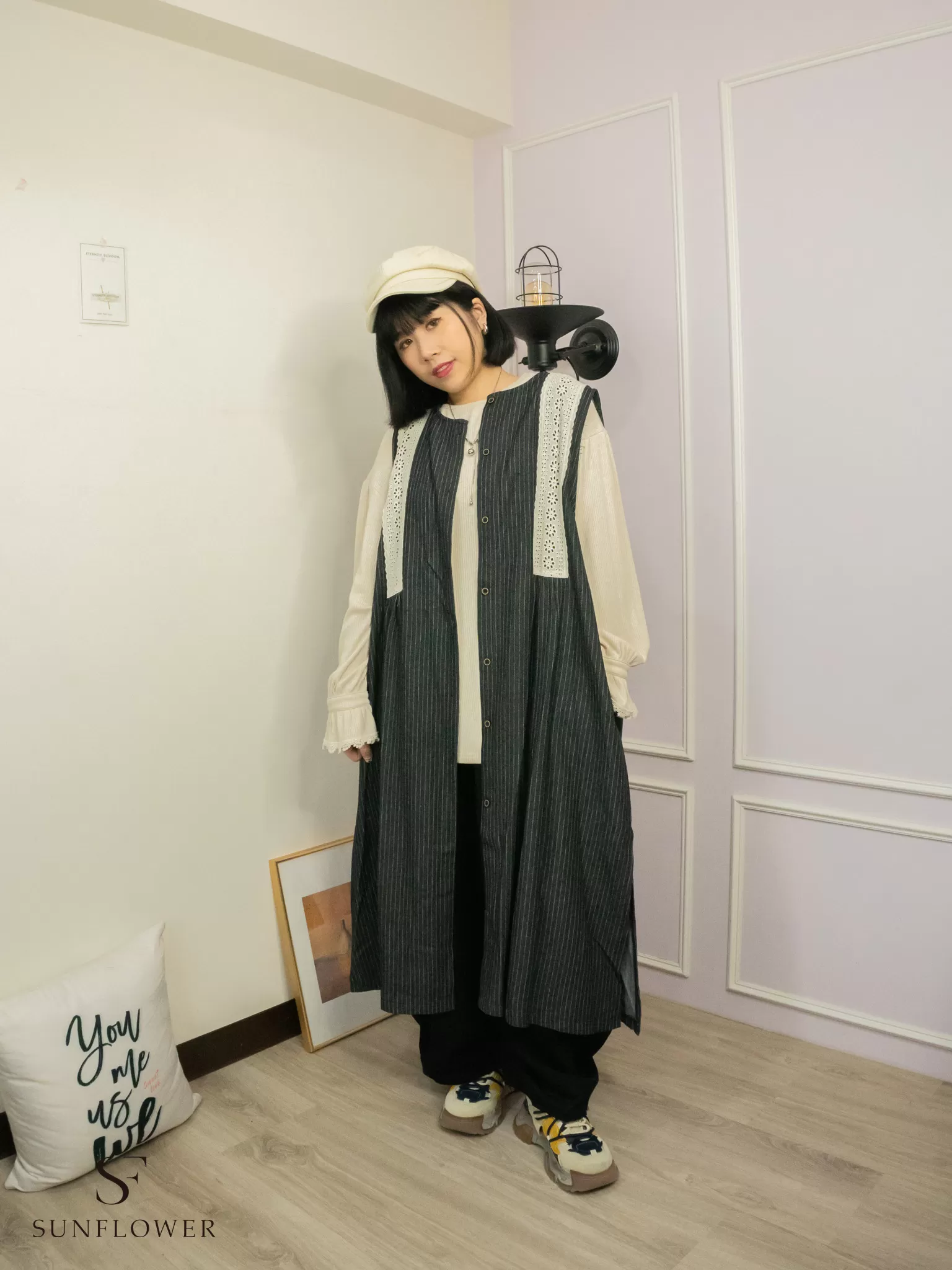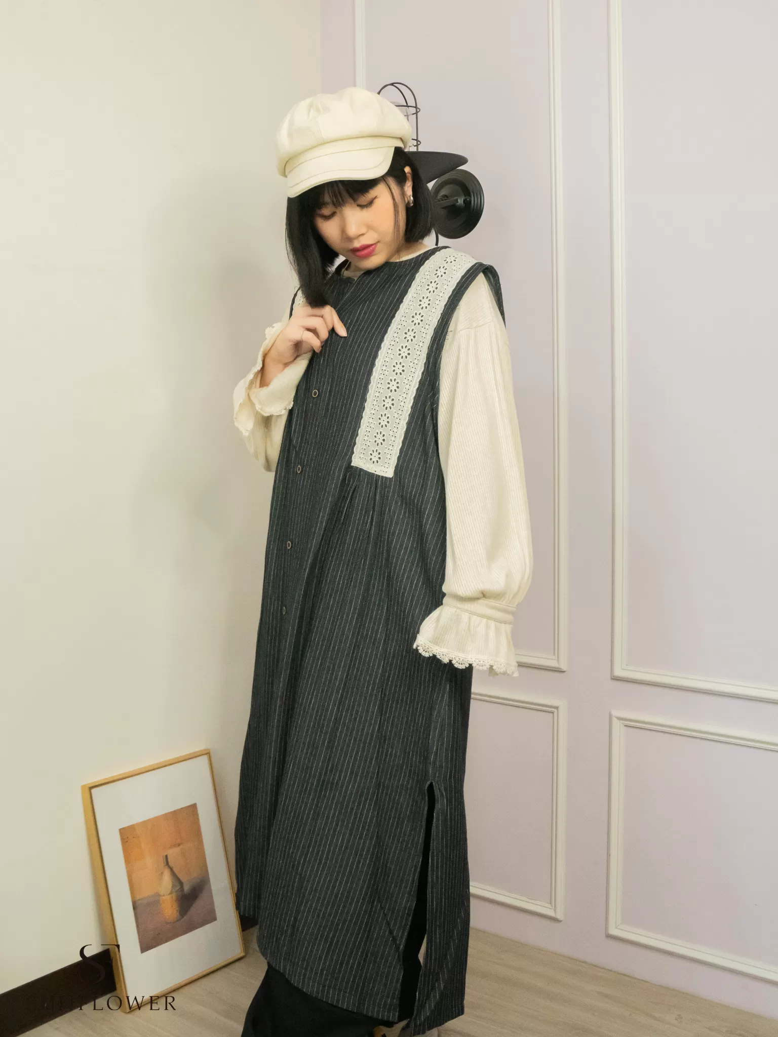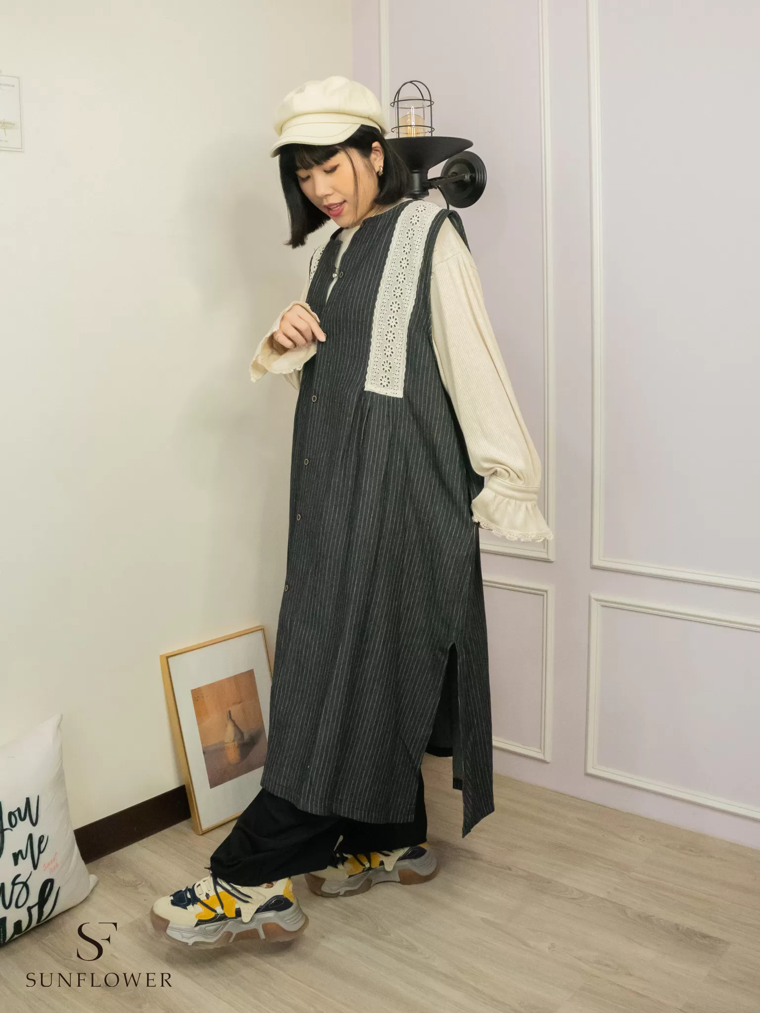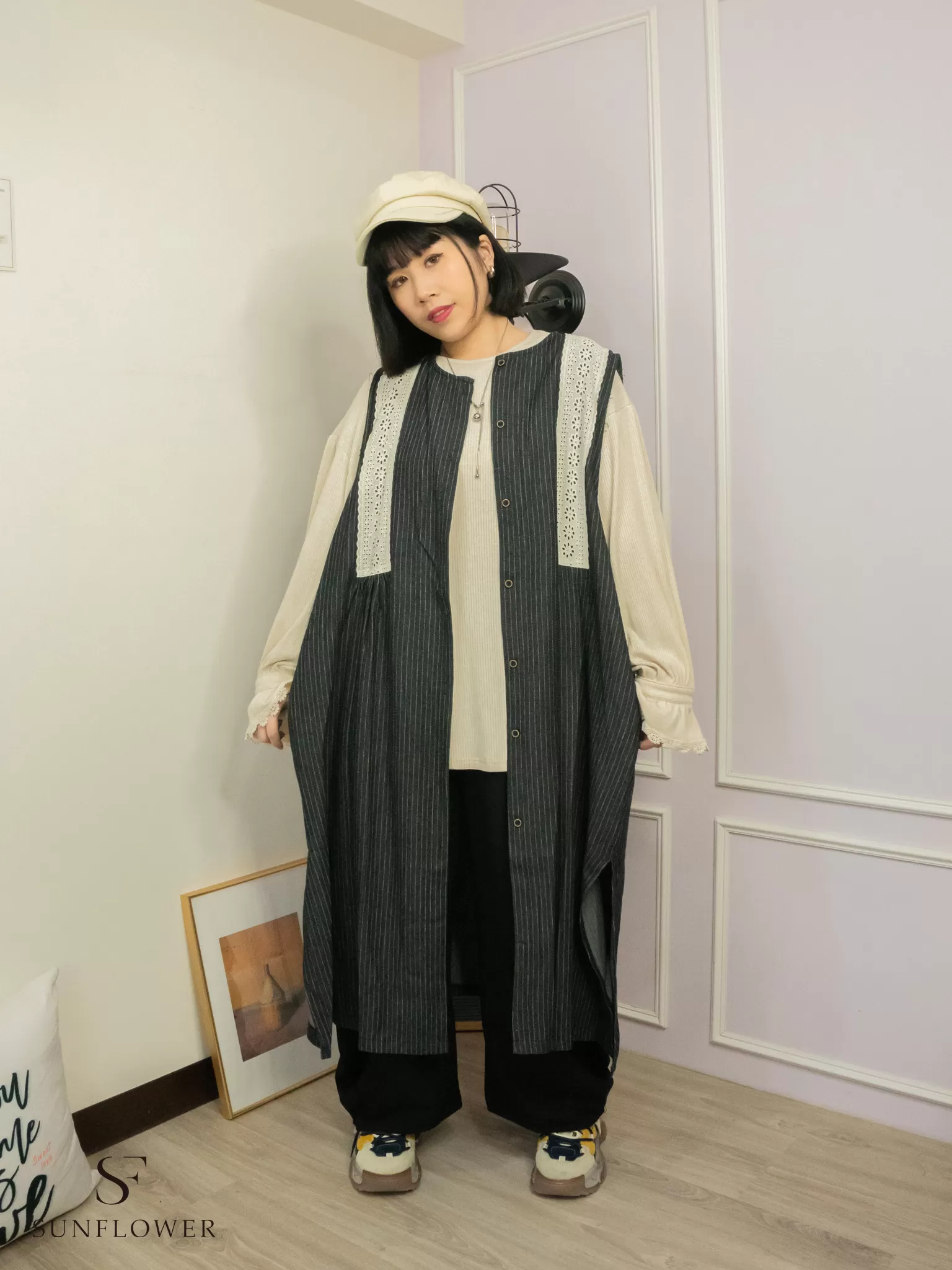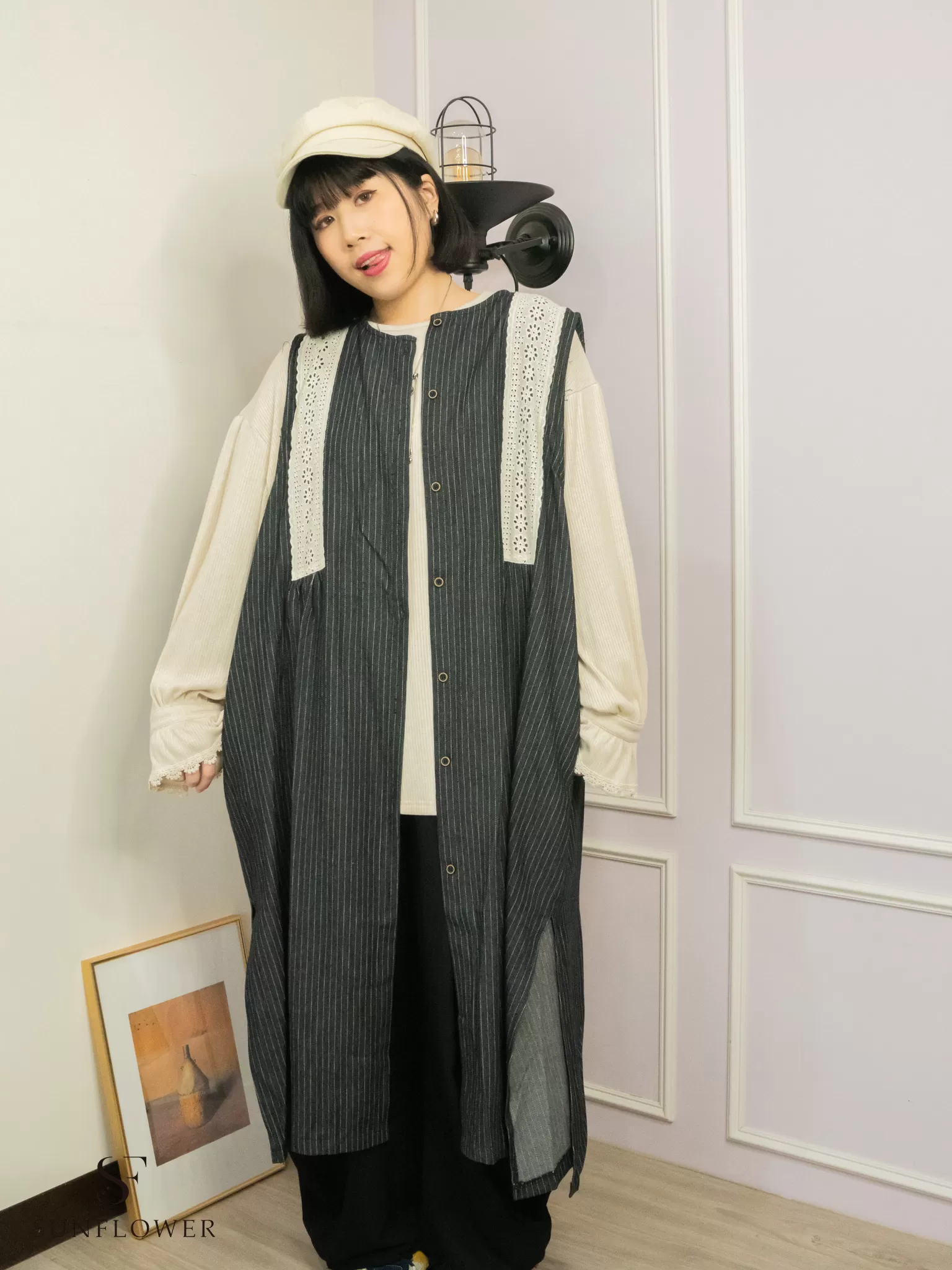 日系|蕾絲條紋|長版外搭背心