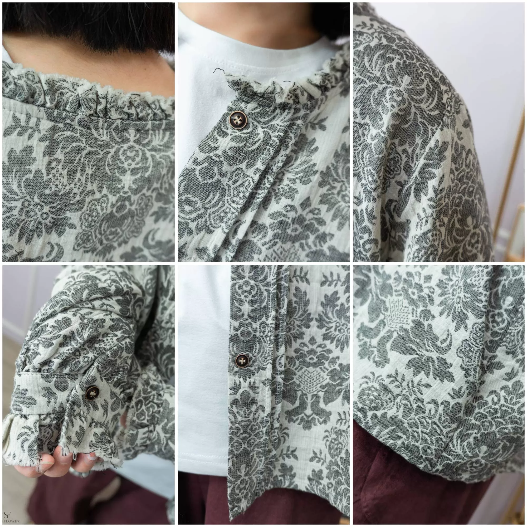 *領口袖口以及下擺,使用了花邊自然不造作的抽鬚設計