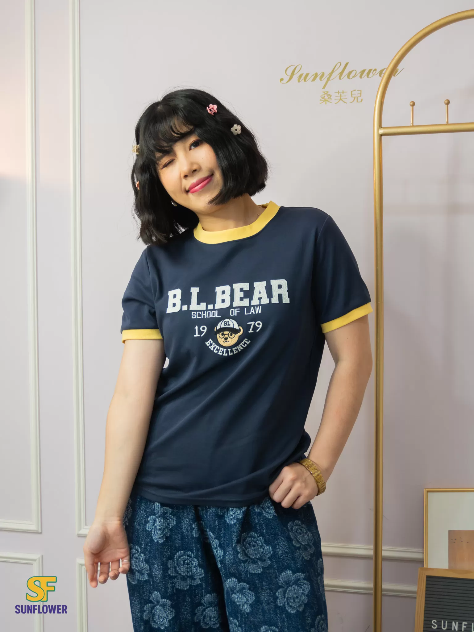 * 撞色領口+重工刺繡小熊圖案 ,立刻變身可愛學院風