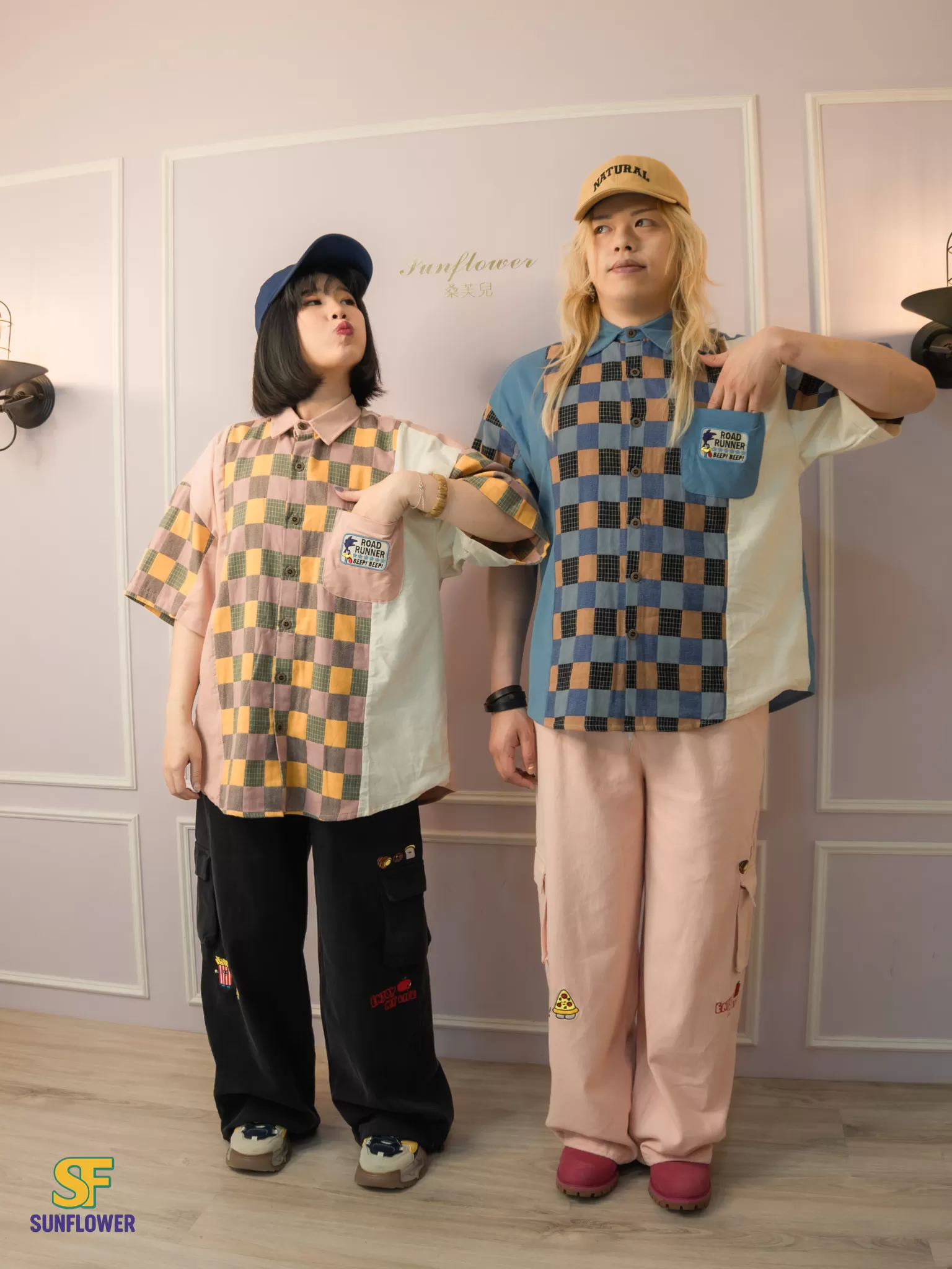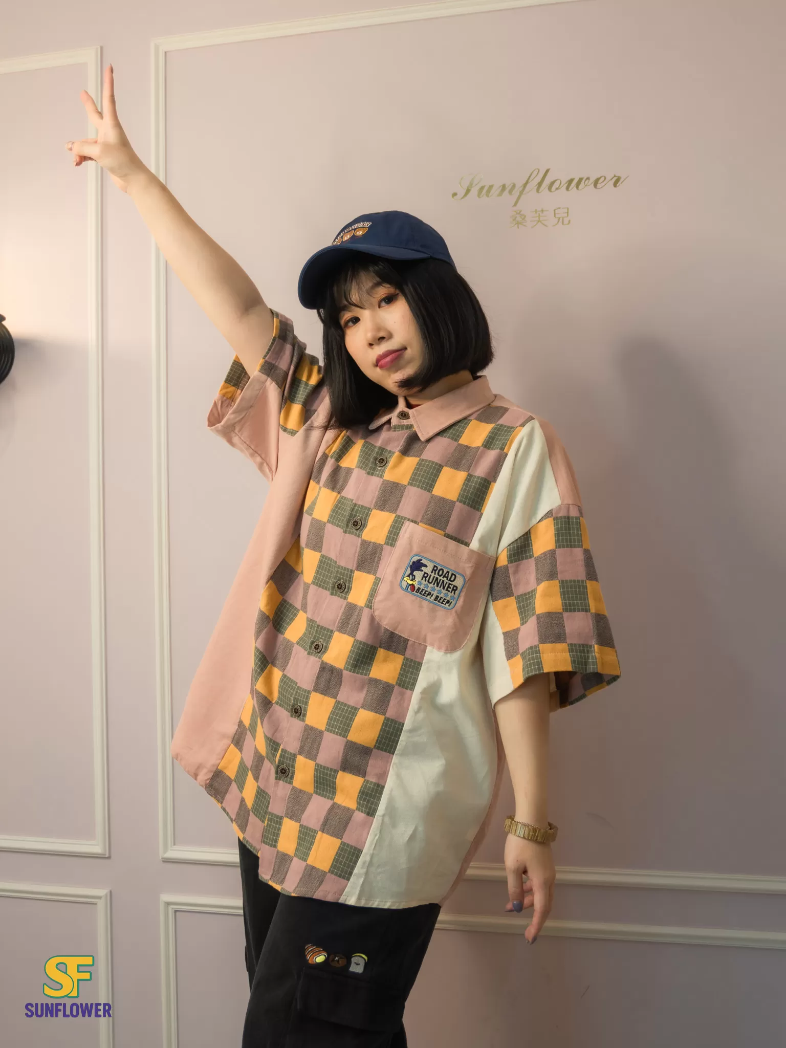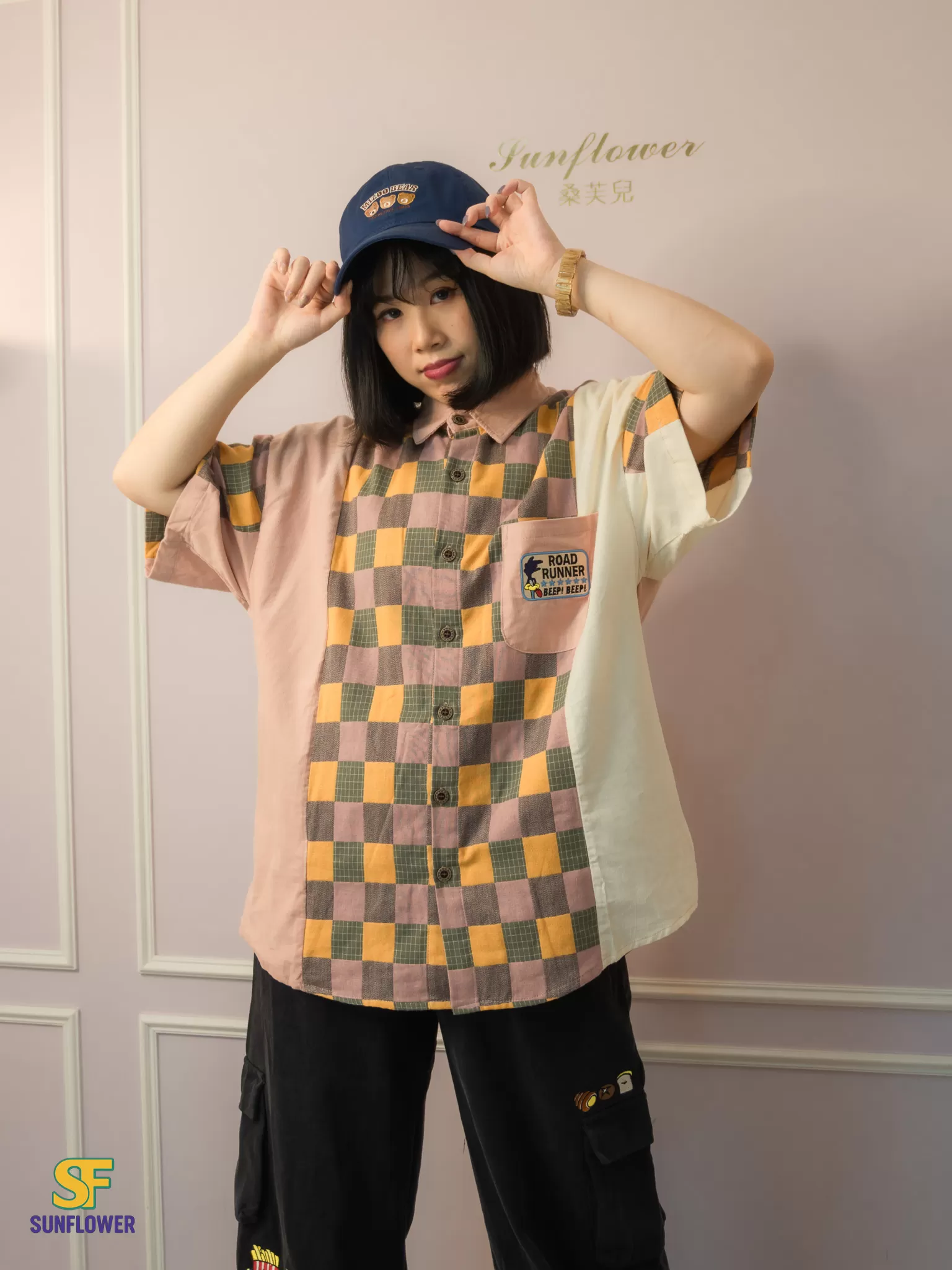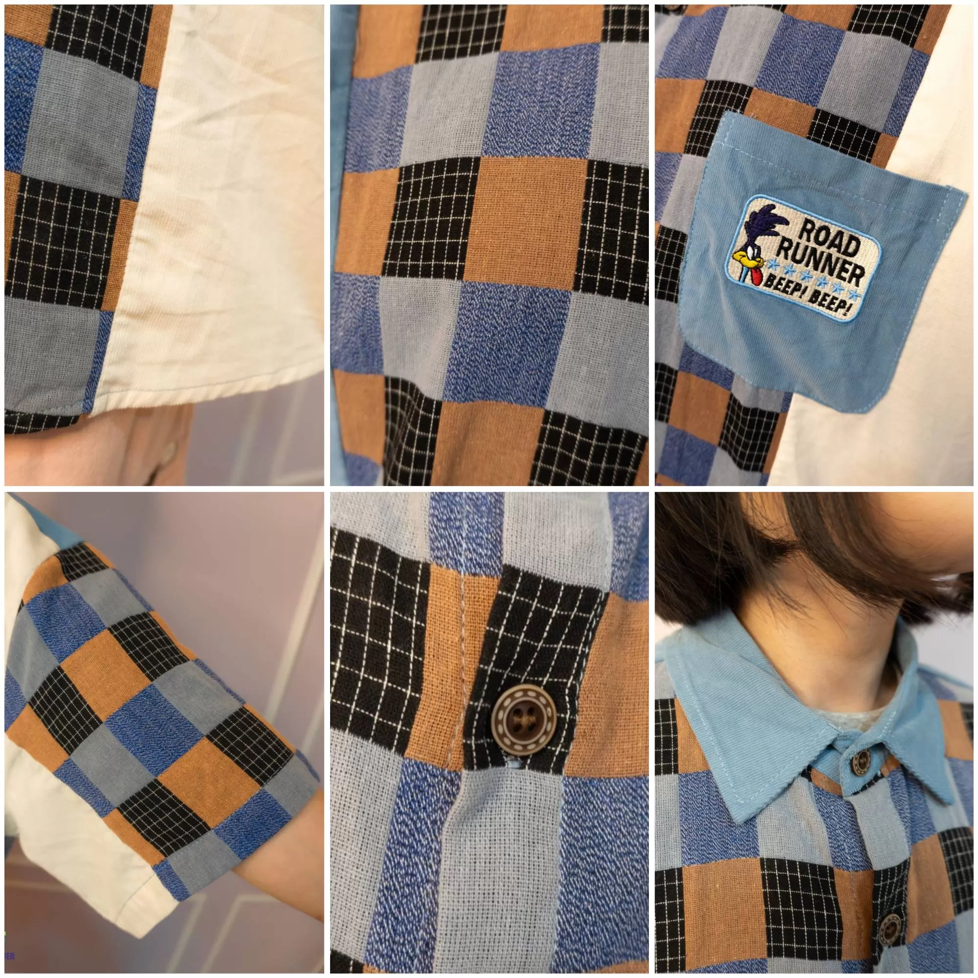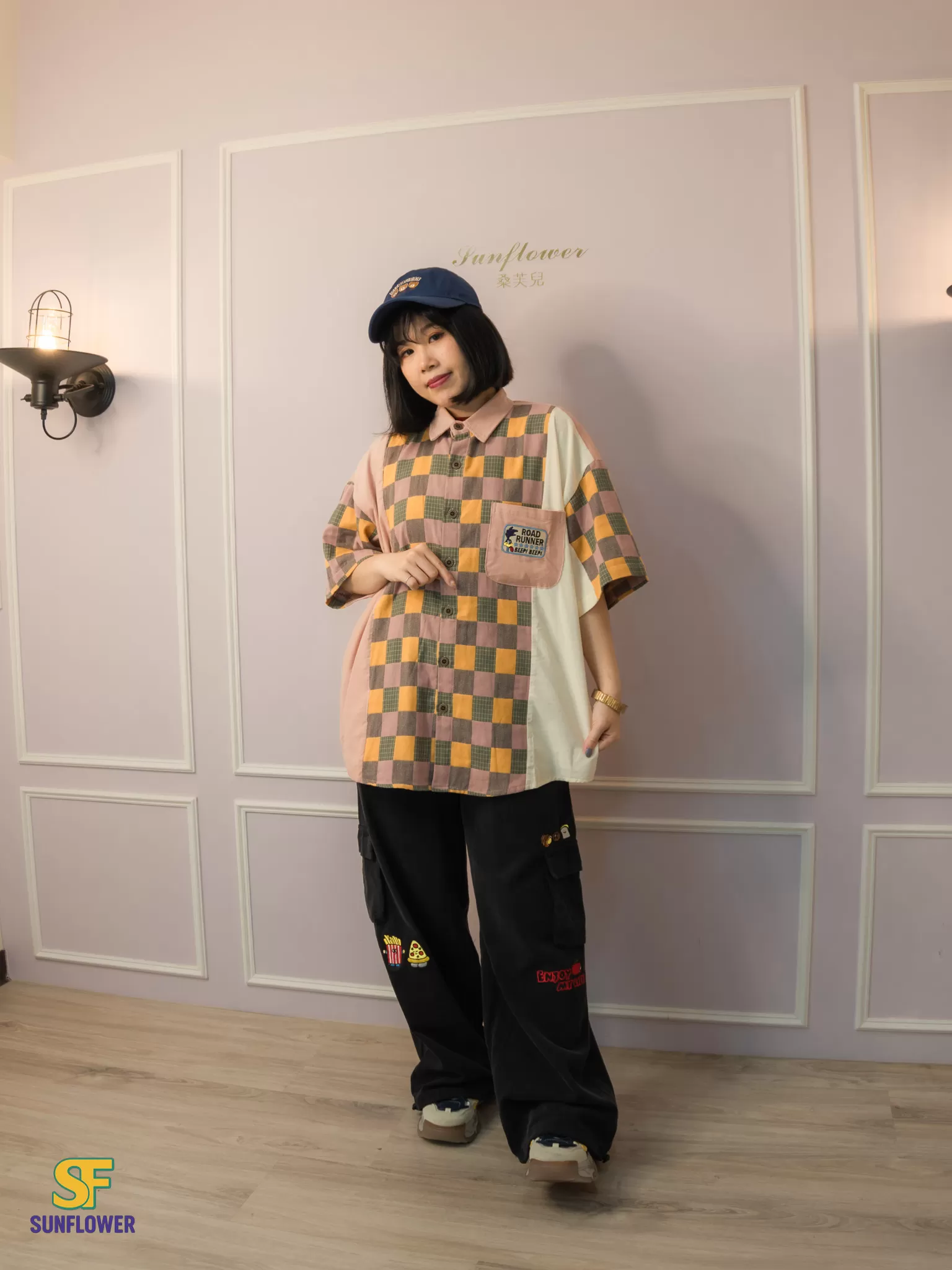 整體以復古格紋為主體,搭配拼色袖身與趣味小口袋標籤