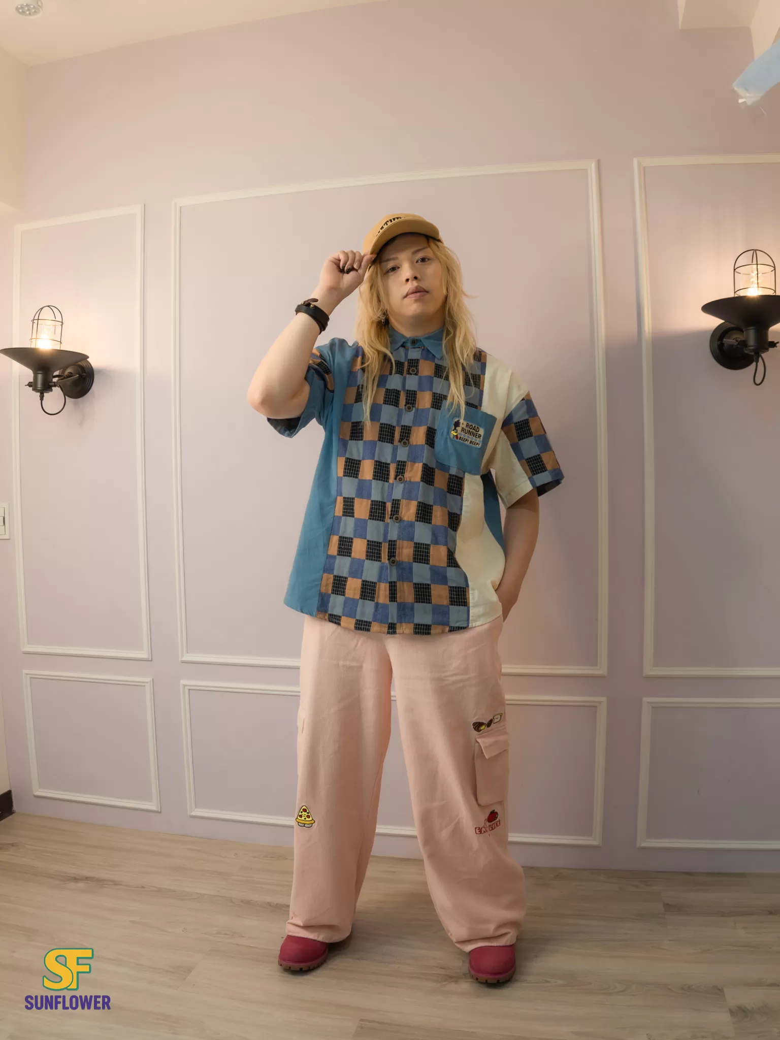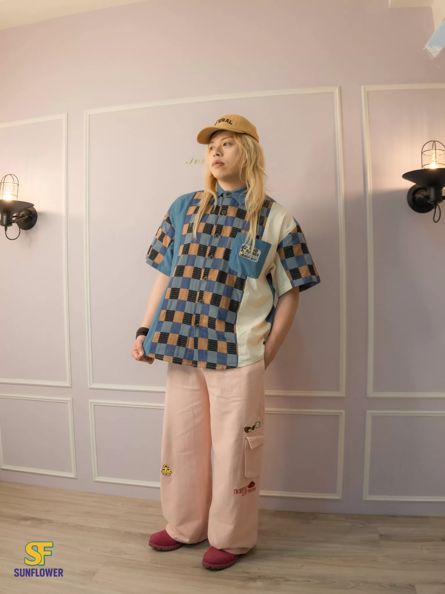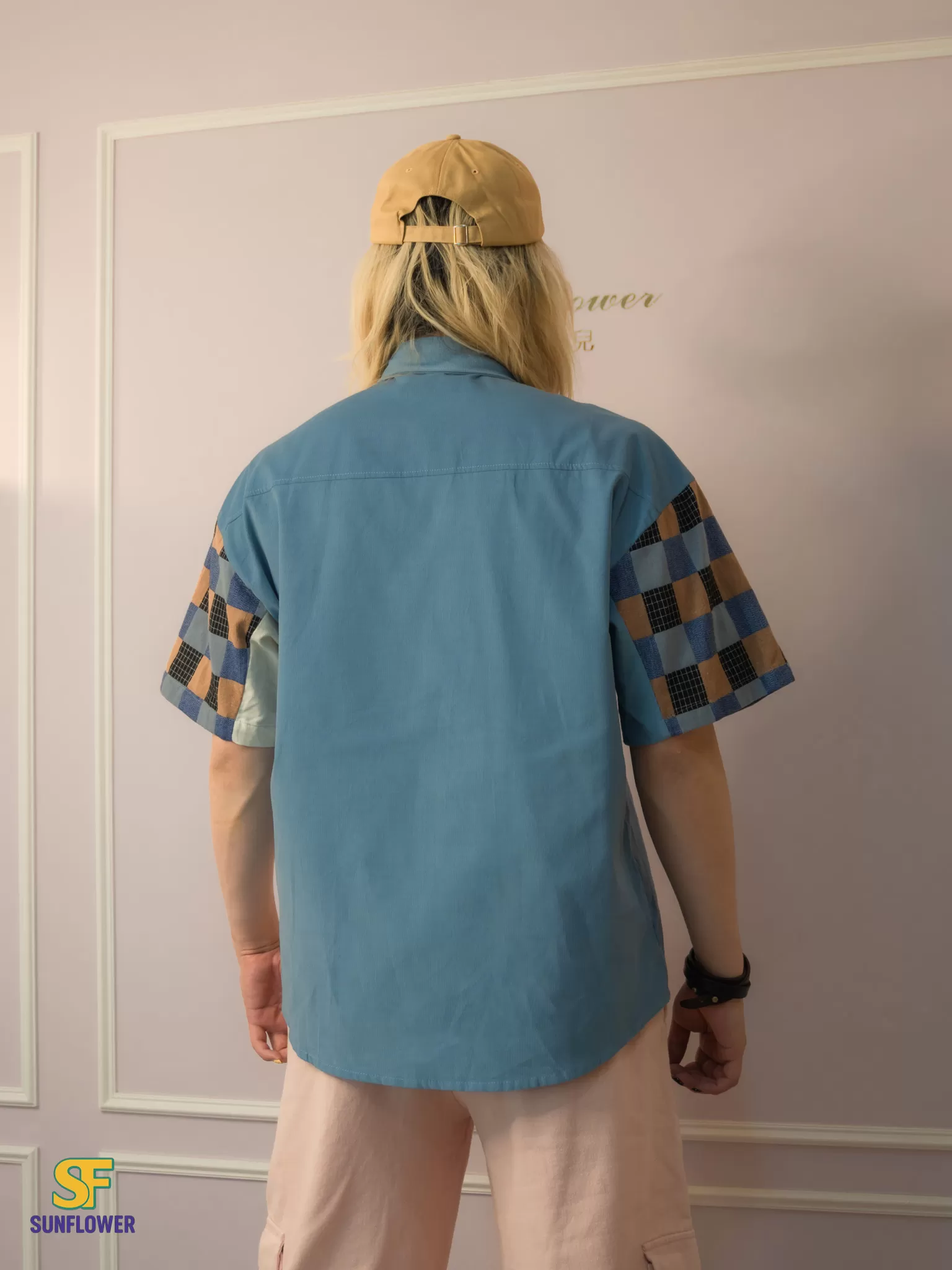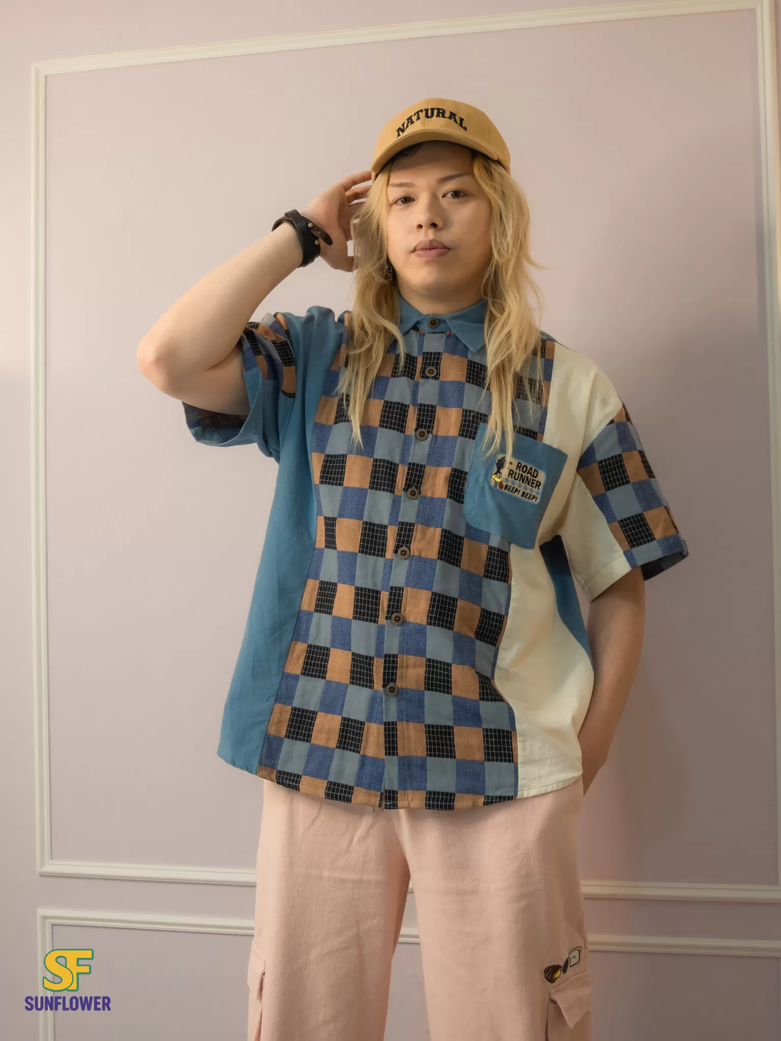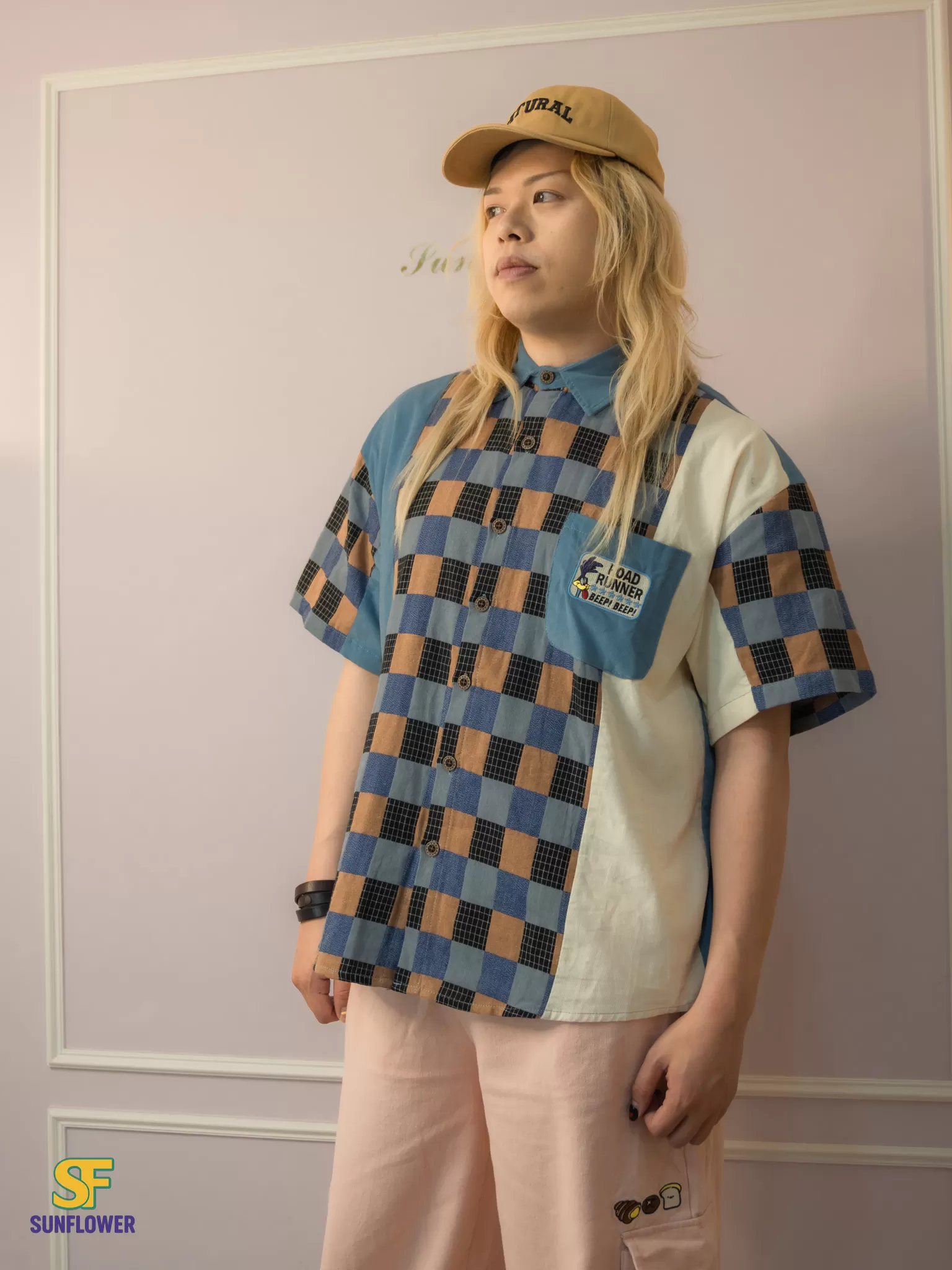 整體以復古格紋為主體,搭配拼色袖身與趣味小口袋標籤