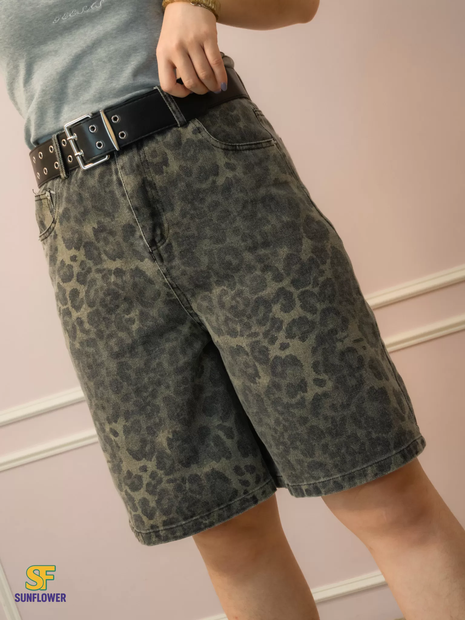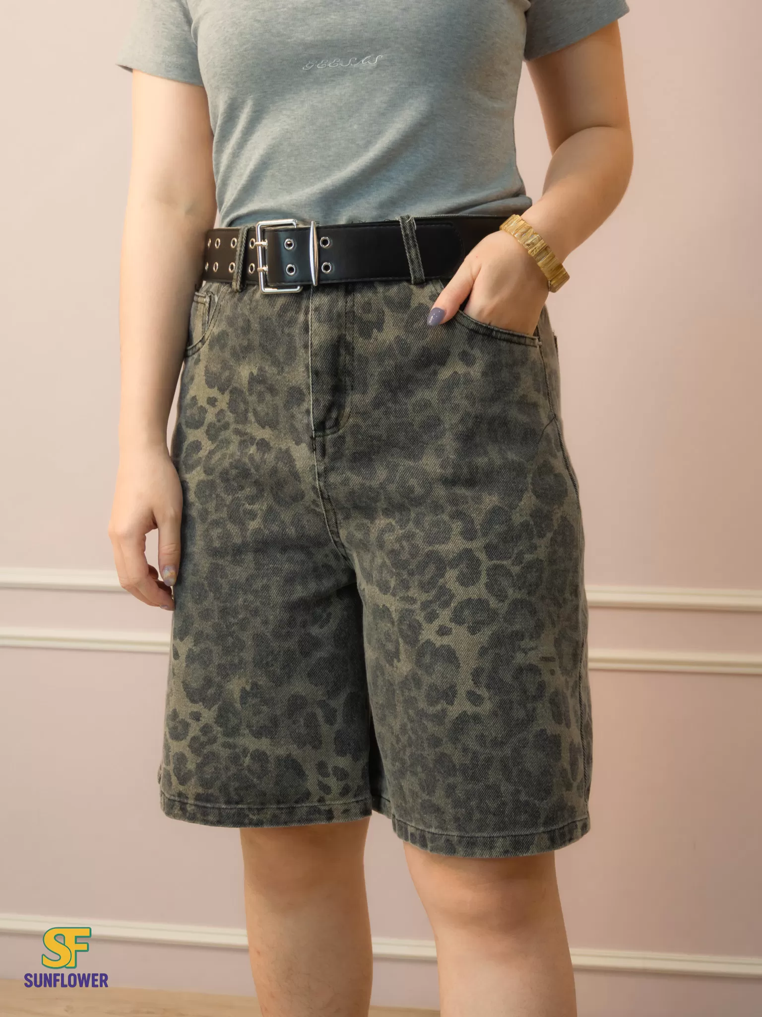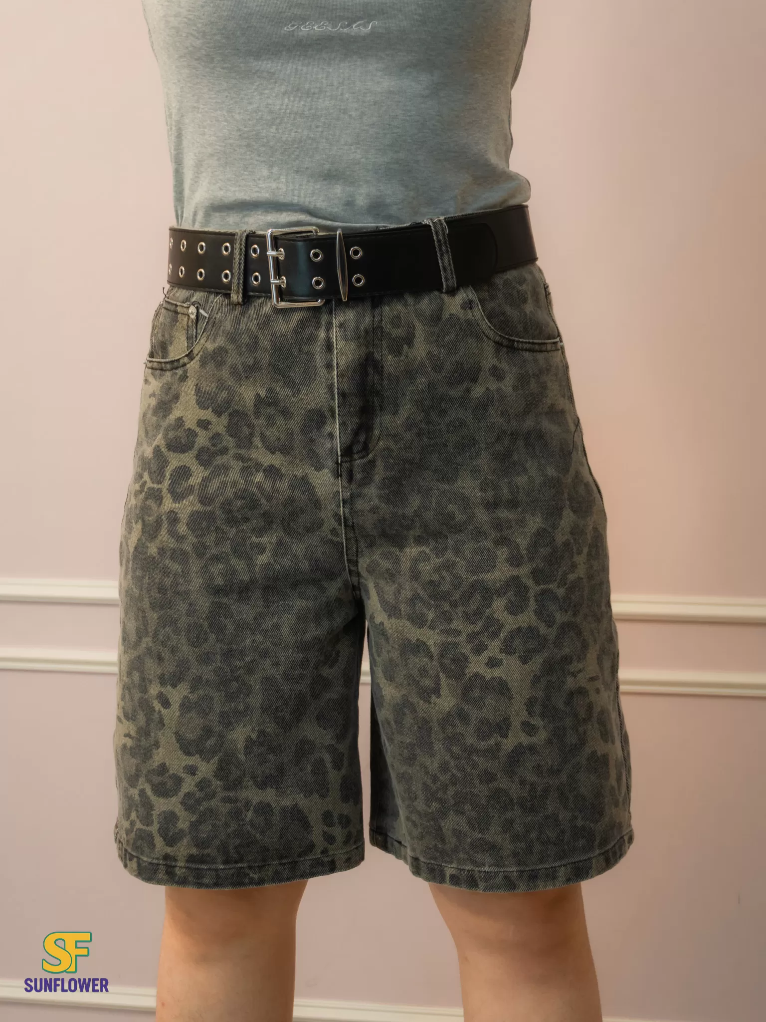 水洗復古刷色|豹紋牛仔短褲+雙扣鉚釘皮帶