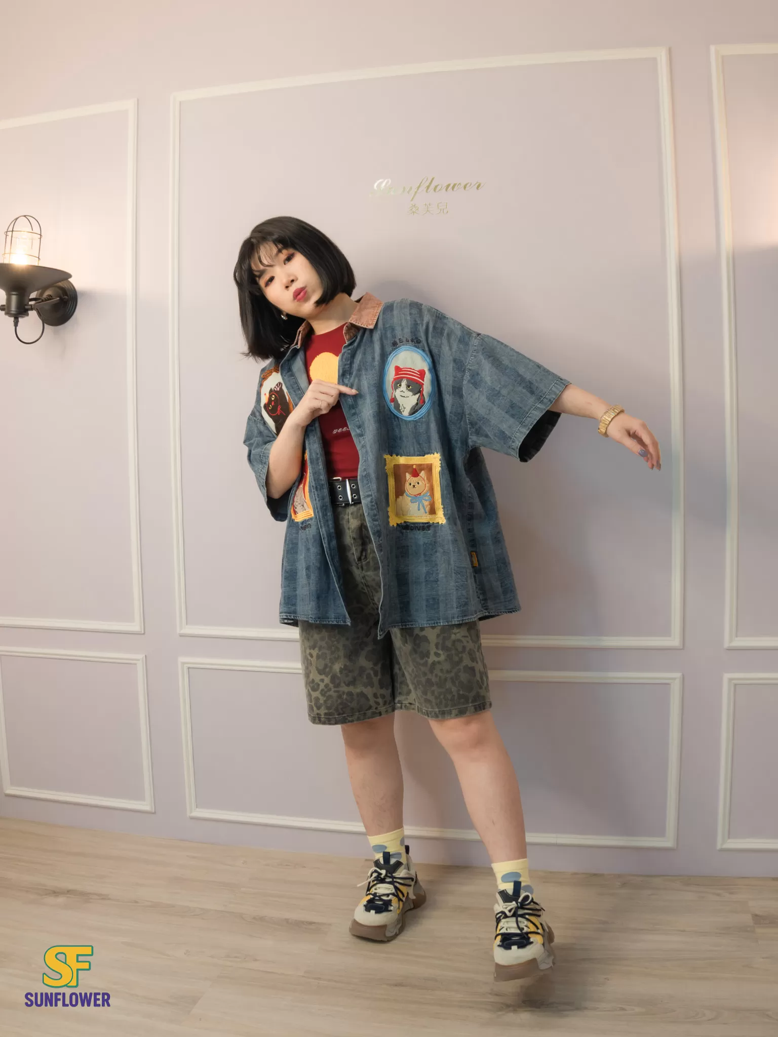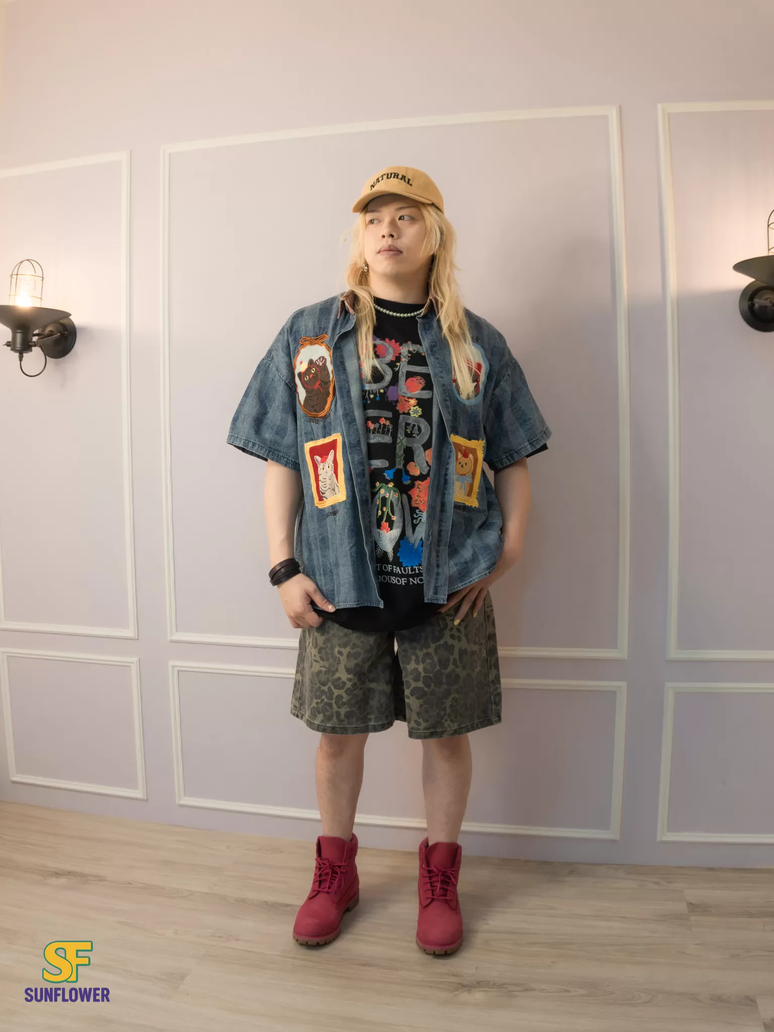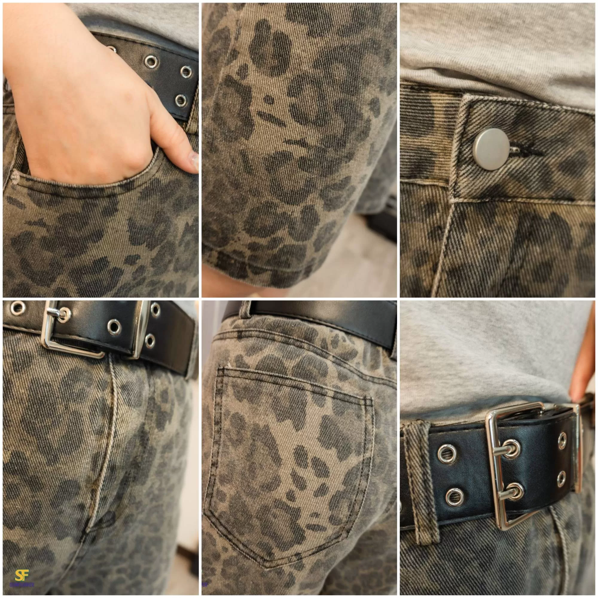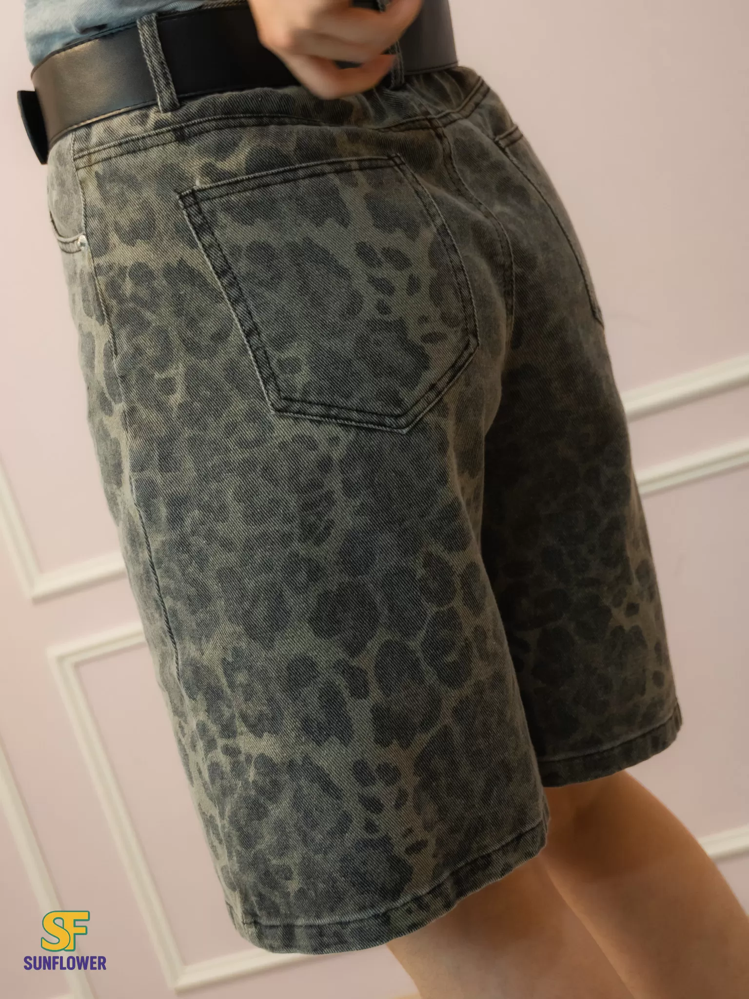 水洗復古刷色|豹紋牛仔短褲+雙扣鉚釘皮帶